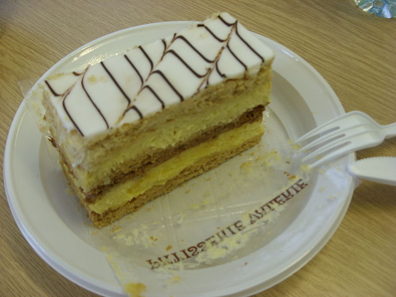 Le mille-feuille est un dessert composé de trois couches de pâte feuilletée ainsi que de deux couches de crème pâtissière. Son nom vient bien évidemment du nombre élevé de feuillets de pâte qui le compose (729 paire de feuillets en réalité, et non pas mille…).